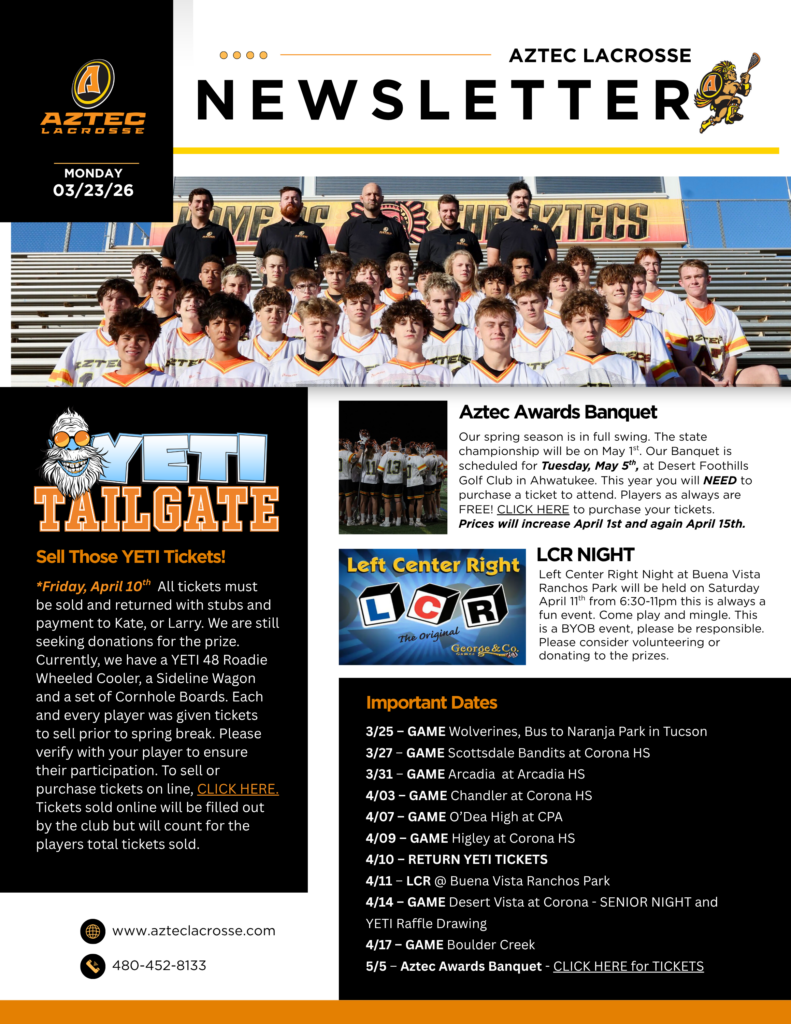 Read MoreIt’s time for our annual YETI Tailgate fundraiser, and we’re excited to get everyone involved. Ticket Distribution & Sales Each player will receive a packet of 24 tickets. These are valued at $10 each (or $50 for a 6-pack), totaling approximately $200–$240 depending on how they’re sold. Every player is responsible for selling their full…